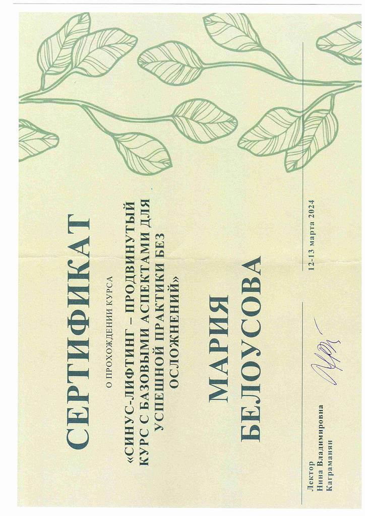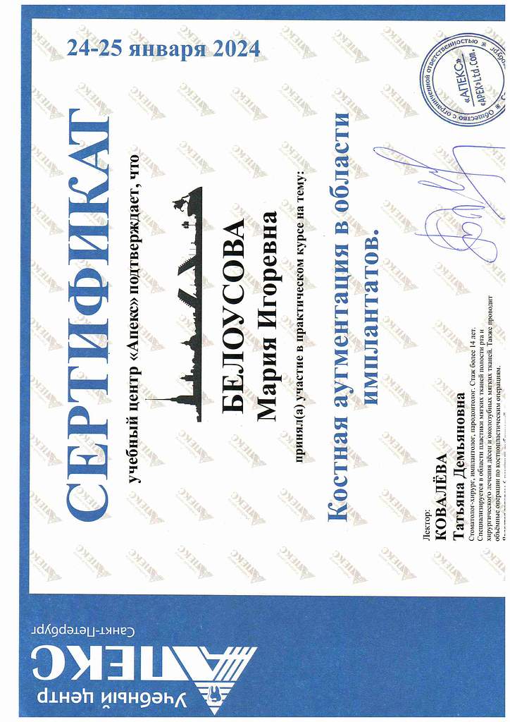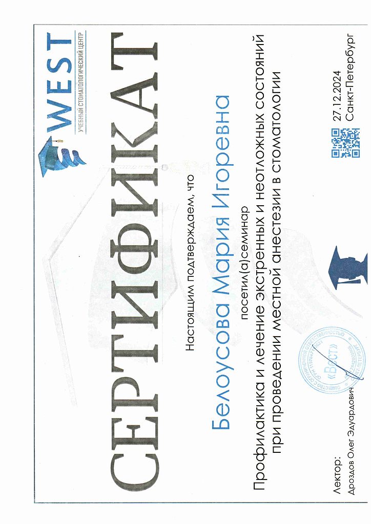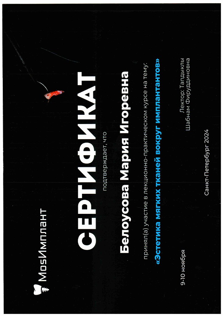 - 2024г. Периодическая аккредитация по специальности "Стоматология хирургическая". Государственное бюджетное образовательное учреждение дополнительного профессионального образования "Российская медицинская академия непрерывного профессионального образования" Министерства здравоохранения Российской Федерации. Действует до 26.03.2029г.